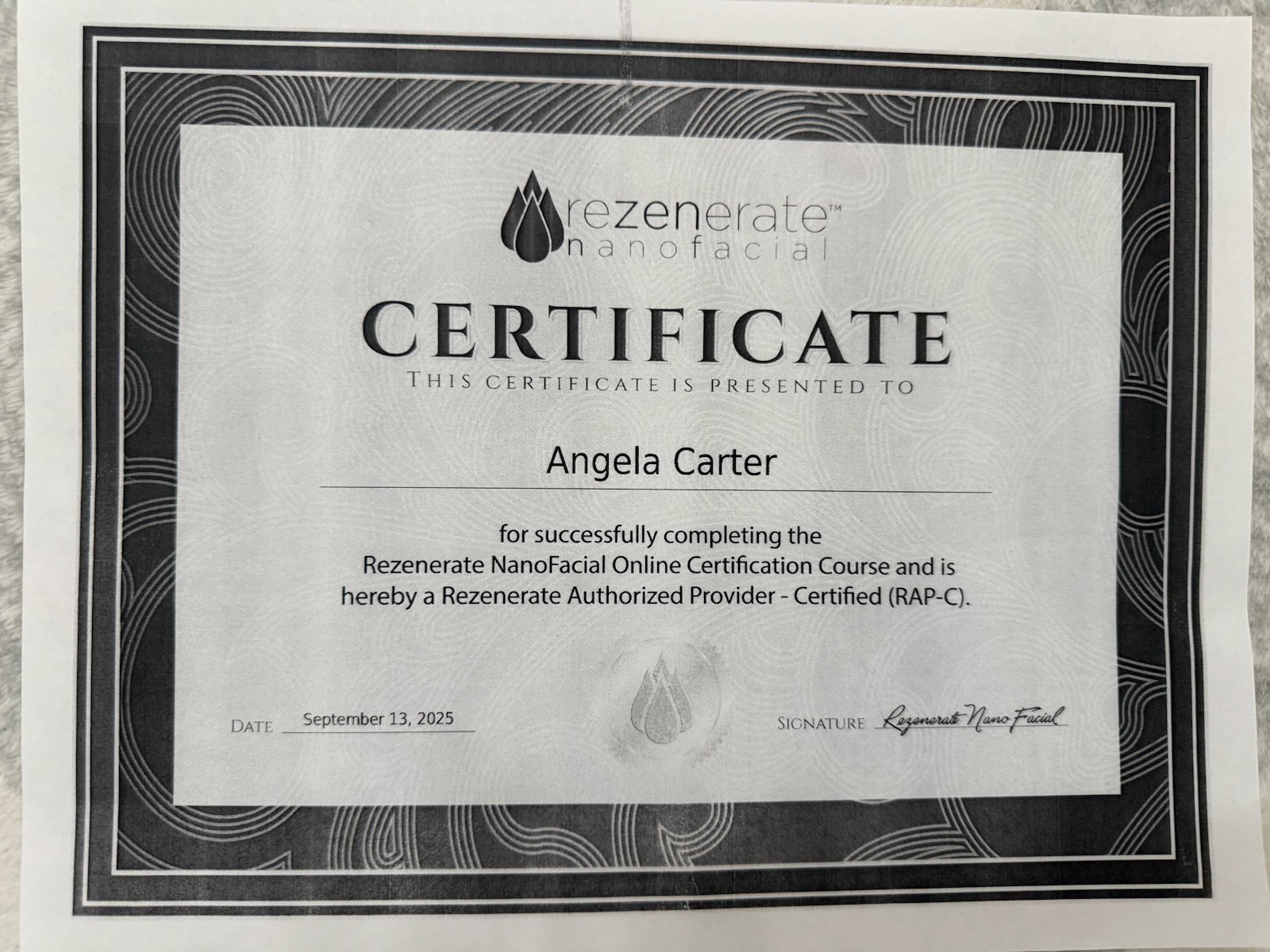 After several years of research, Angela has recently invested time and money into learning a new technology for facial rejuvenation, called a “nano facial.” Rezenerate has developed a sterile pen tip that creates tiny channels in the skin surface. These channels deliver specially designed serums to help erase wrinkles and lines, hydrate skin or fade pigmentation and age spots. The facial is less invasive and non painful, unlike microneedling and can provide many of the same benefits. Learn More about this Service